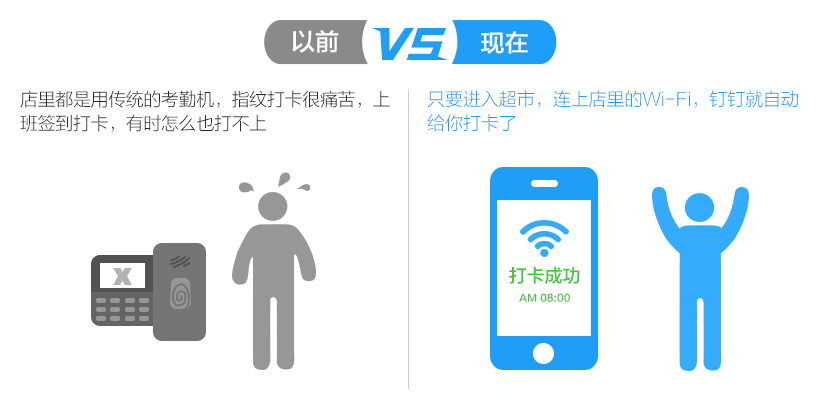 現在好了,只要我進入超市,連上店里的Wi-Fi,釘釘就自動給我打卡了。