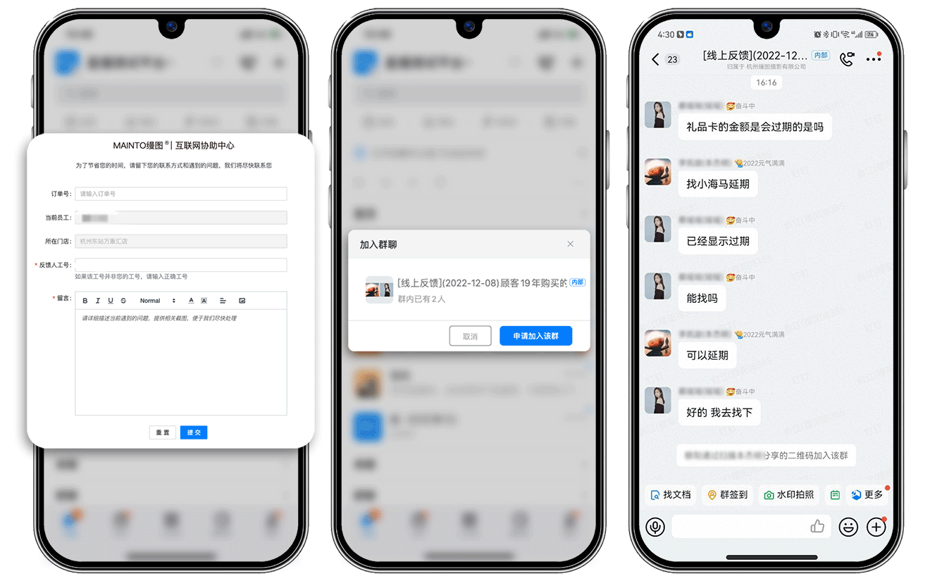 縵圖攝影在全國擁有500多家門店,每天需要服務上千位消費者。在門店服務過程中,一線員工和店長會遇到各種各樣的問題,問題的處理數量和效率很大程度上影響著消費者的拍攝體驗。因此,對門店問題的快速響應和處理是一線員工服務的重要環節。縵圖攝影嘗試數字化手段,探索出了快速進行門店問題處理、日常咨詢的有效工作方式。借助釘釘酷應用能力,一線門店員工在工單系統中的溝通、問題反饋等事項均能夠在最常用的群聊場景中完成,通過酷應用卡片一鍵工單群創建,快速流轉到對應負責人及時響應問題,形成處理問題的閉環。