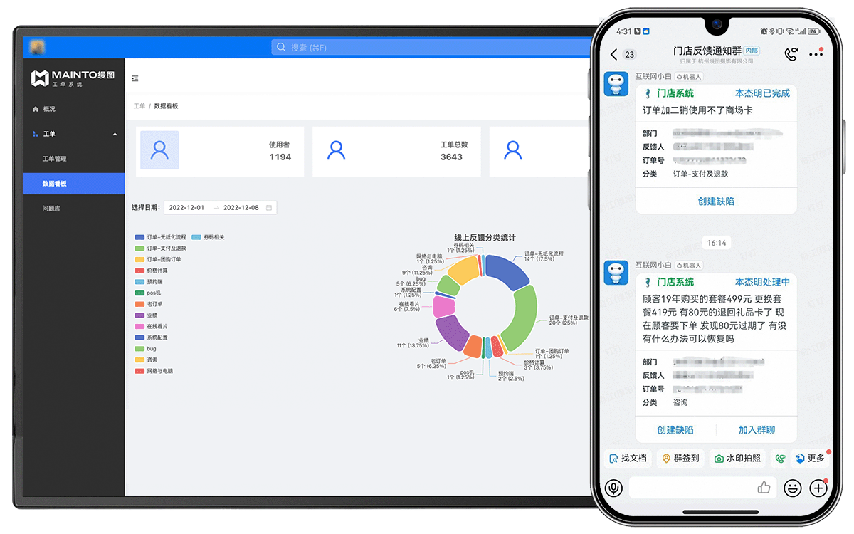 當門店遭遇需要求助的問題時,員工可以先通過縵圖工單系統進行問題提交。系統收到問題后,會在中臺反饋群內會形成群卡片通知,對應負責人可以實時收到指派提醒并立即進群響應處理,大大提升門店問題響應效率。針對群內的服務情況,服務管理者可以進群進行監督,服務過程留痕。當問題解決后,工單群會自動解散,避免不必要的消息打擾和群聊堆積。從總體的服務效率來看,無論是工作日還是非工作時間,單個問題從接收、響應再到最終問題處理完畢,整個流程平均耗時不到10分鐘,讓門店的消費者擁有了更好的服務體驗。