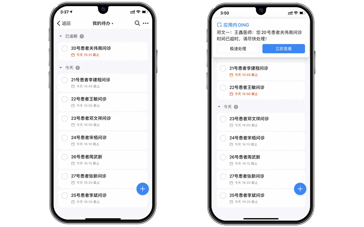 通過釘釘搭建的醫院精準組織架構,包含部門、科室、人員、管理角色等多維度,一方面構建覆蓋全業務的流程管理體系,實時統計相關數據,另一方面能夠通過架構實現精準的在線協同。