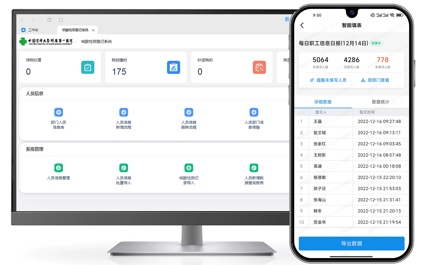 順應新冠肺炎疫情防控要求,醫院需要每天統計核酸登記數據、重點區域數據、職工信息填報數據、三方填報數據等,以往通常使用手工記錄, Excel表格統計后再由部門報送的方式;不僅效率低,而且經常存在數據錯漏等情況。由于醫院防疫工作時間緊、需求個性化強,一時間也很難找到完全匹配醫院需求的系統。